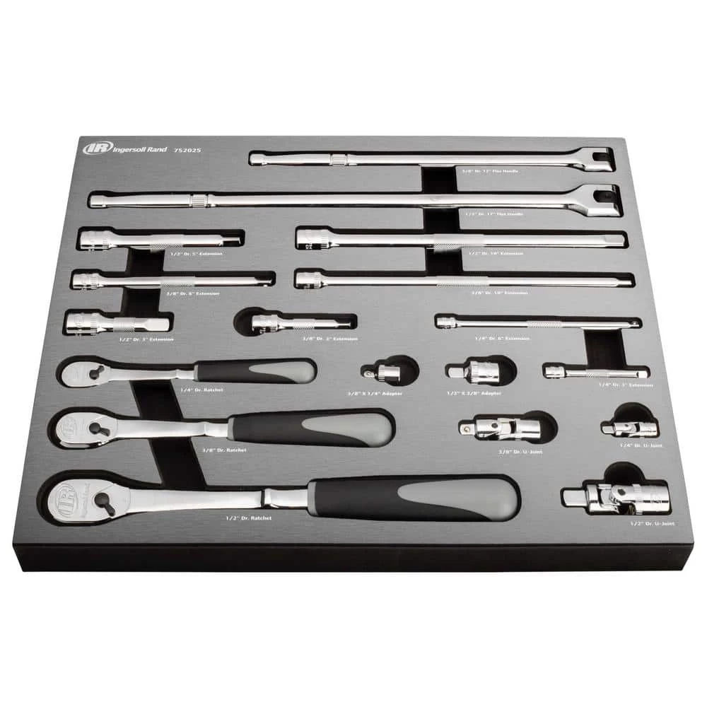 The Ingersoll Rand set includes a large selection of the most commonly socket accessories along with 90 Tooth, machined geared, sealed head ratchets that feature Double Injection Handles for comfort and grip. The set is housed in a laser-cut foam organizer tray that drops easily into any tool chest drawer. Tools Meet or Exceed ANSI Standards for Fit, Finish and Torque.