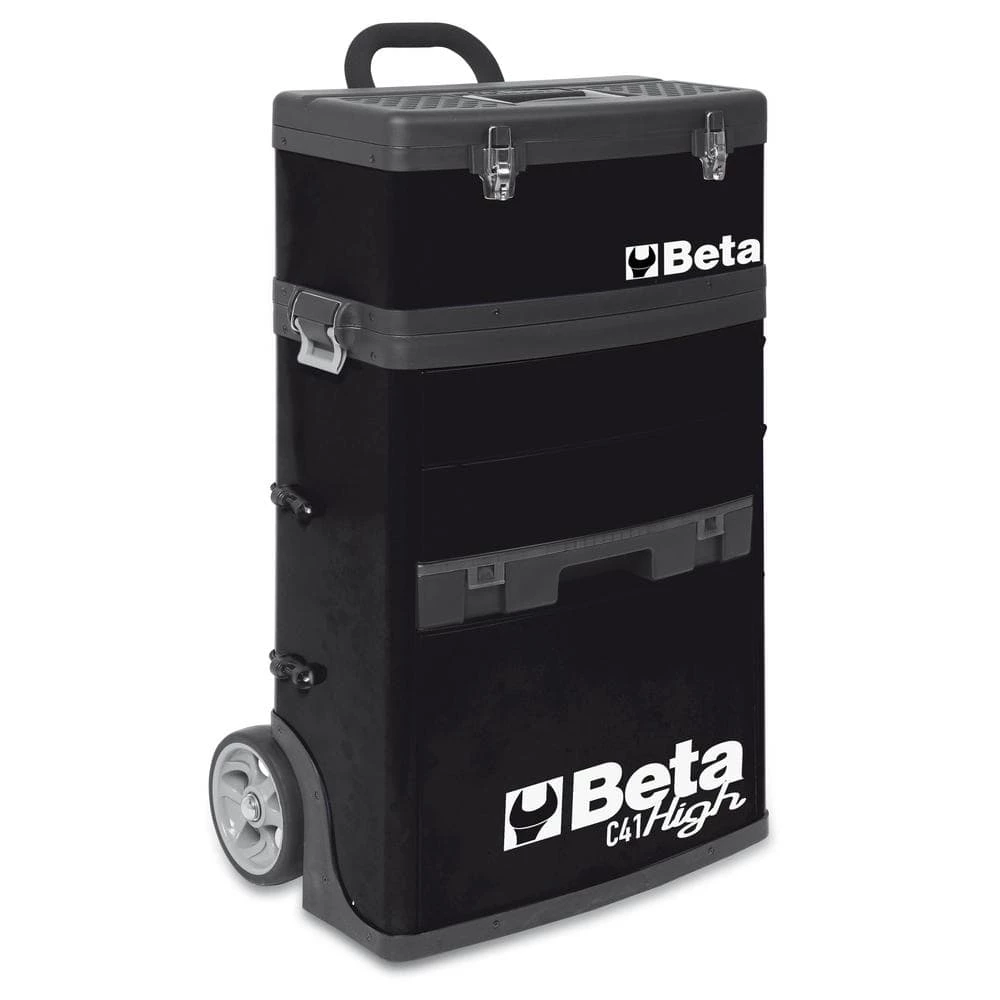 Main features: Sheet metal frame and plastic tops, synonymous with remarkable sturdiness and reduced weight. 2 detachable modules: 1 upper tool box, 1 module with 2-drawers 3.74 in. H, 1 pull-out case made of plastic, 2.60 in. mm H and 1-drawer 11.61 in. H. Oversized castors ( 6.30 in.), built into frame for easy transport for example, on steps. Side centralized lock for closing drawers of lower module. Drawers with ball bearing slides and double closing hook. Telescopic aluminum handle. Small tool holder built into upper tool box. Lower drawer with double ball-bearing slide.