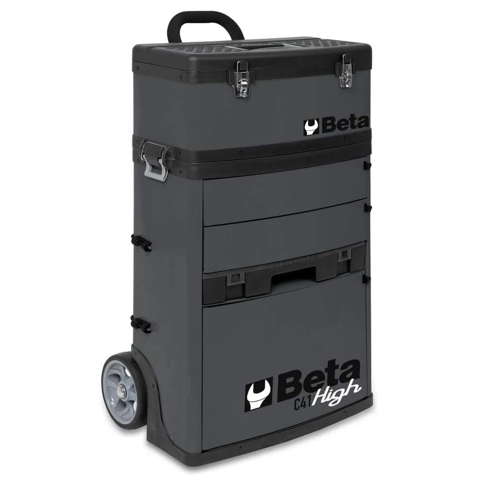 Main features: Sheet metal frame and plastic tops, synonymous with remarkable sturdiness and reduced weight. 2 detachable modules: 1 upper tool box, 1 module with 2-drawers 3.74 in. H, 1 pull-out case made of plastic, 2.60 in. mm H and 1-drawer 11.61 in. H. Oversized castors ( 6.30 in.), built into frame for easy transport for example, on steps. Side centralized lock for closing drawers of lower module. Drawers with ball bearing slides and double closing hook. Telescopic aluminum handle. Small tool holder built into upper tool box. Lower drawer with double ball-bearing slide.