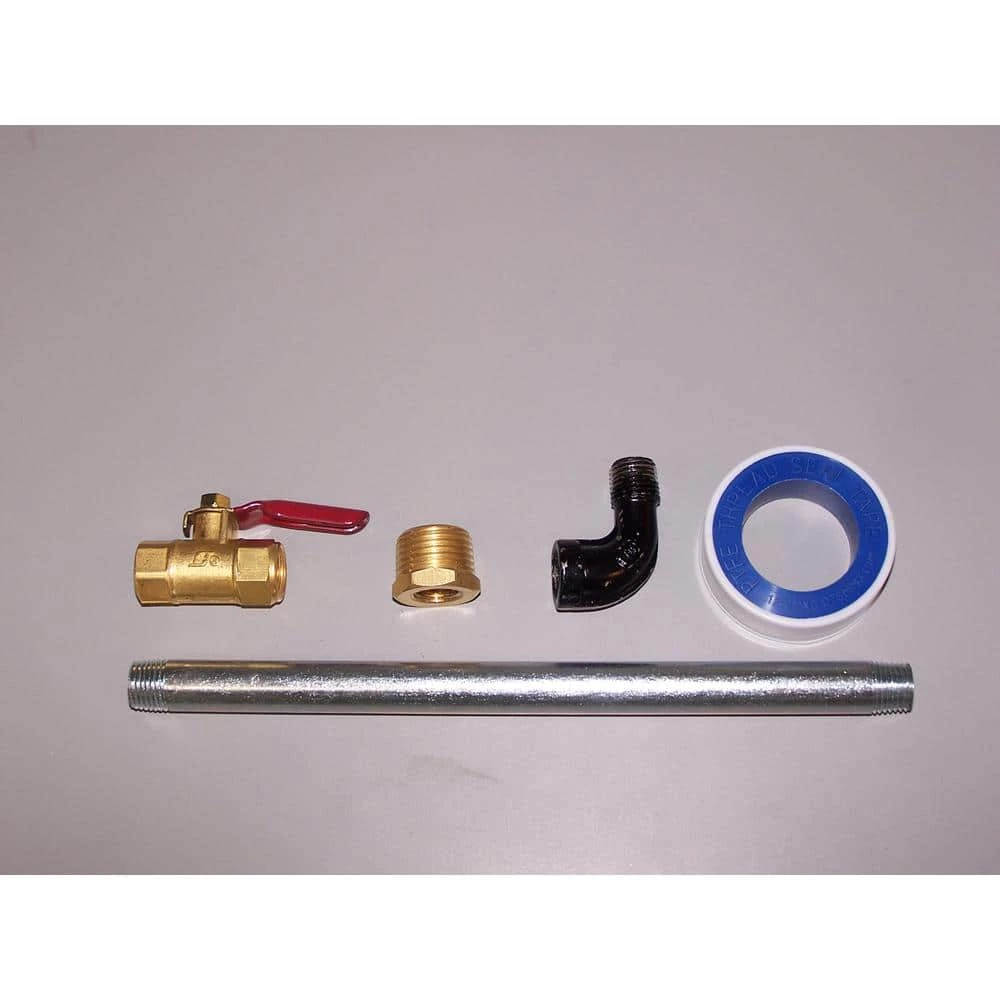 - Kit includes: 1/2 in. M to 1/4 in. F brass reducer, 1/4 in. M x 1/4 in. F galvanized street elbow, 8 in. x 7 mm galvanized nipple pipe (M/M), 1/4 in. brass ball valve drain (F/F) and small roll of thread tape (to be applied to all threads)