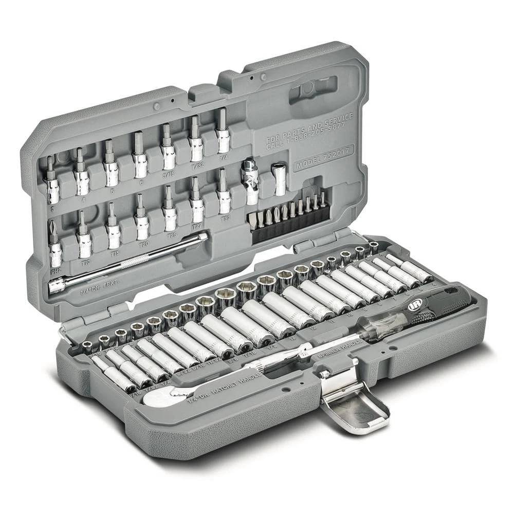 The Ingersoll Rand 66 piece 1/4-inch drive master mechanic’s socket set combines the most commonly used technician tools in a comprehensive all-in-one collection. The set includes 51 SAE and metric sockets, a 72 tooth ratchet and 14 tools and accessories. All Ingersoll Rand master mechanic tool sets include a durable, high-quality storage case that breaks down with removable hinges for easy storage in toolbox drawers and reassembles in seconds for transporting tools to the job site. Torx is a registered trademark of Acument Intellectual Properties LLC