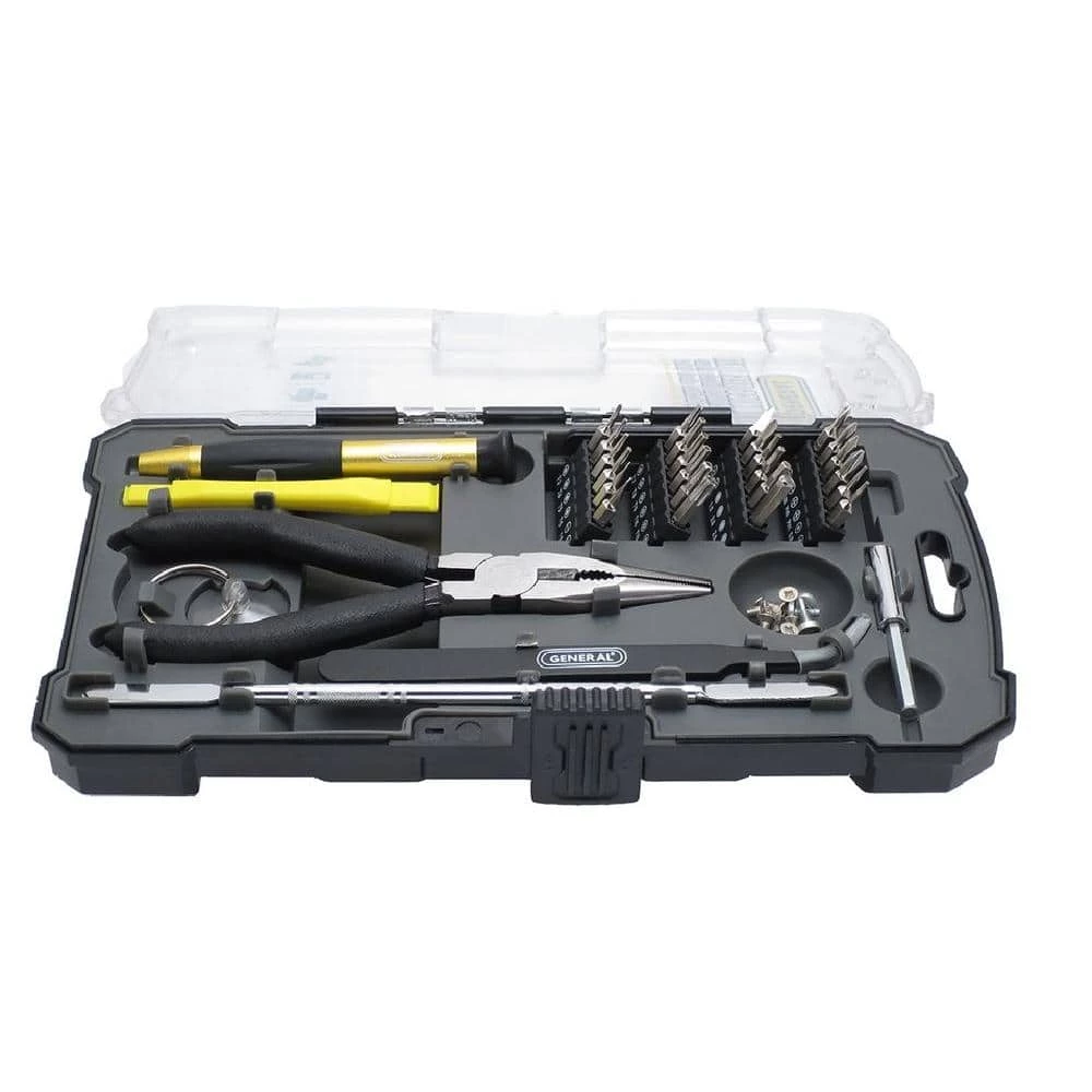 The General Tools 32-piece Electronics Tech Kit is perfect for all of your home electronics needs. It contains Stainless steel tweezers, a suction cup, a 60 mm extension shaft, a magnetic bowl, a double-sided mini pry bar, chain nose serrated jaw pliers with a cutting function, a 180 mm metal spludger, a precision aluminum screwdriver with a magnetic bit holder and a variety of bits. Whether you are repairing your keyboard, phone, or other electronic device, know that the General Tools 32-piece Electronics Tech kit will get the job done.
