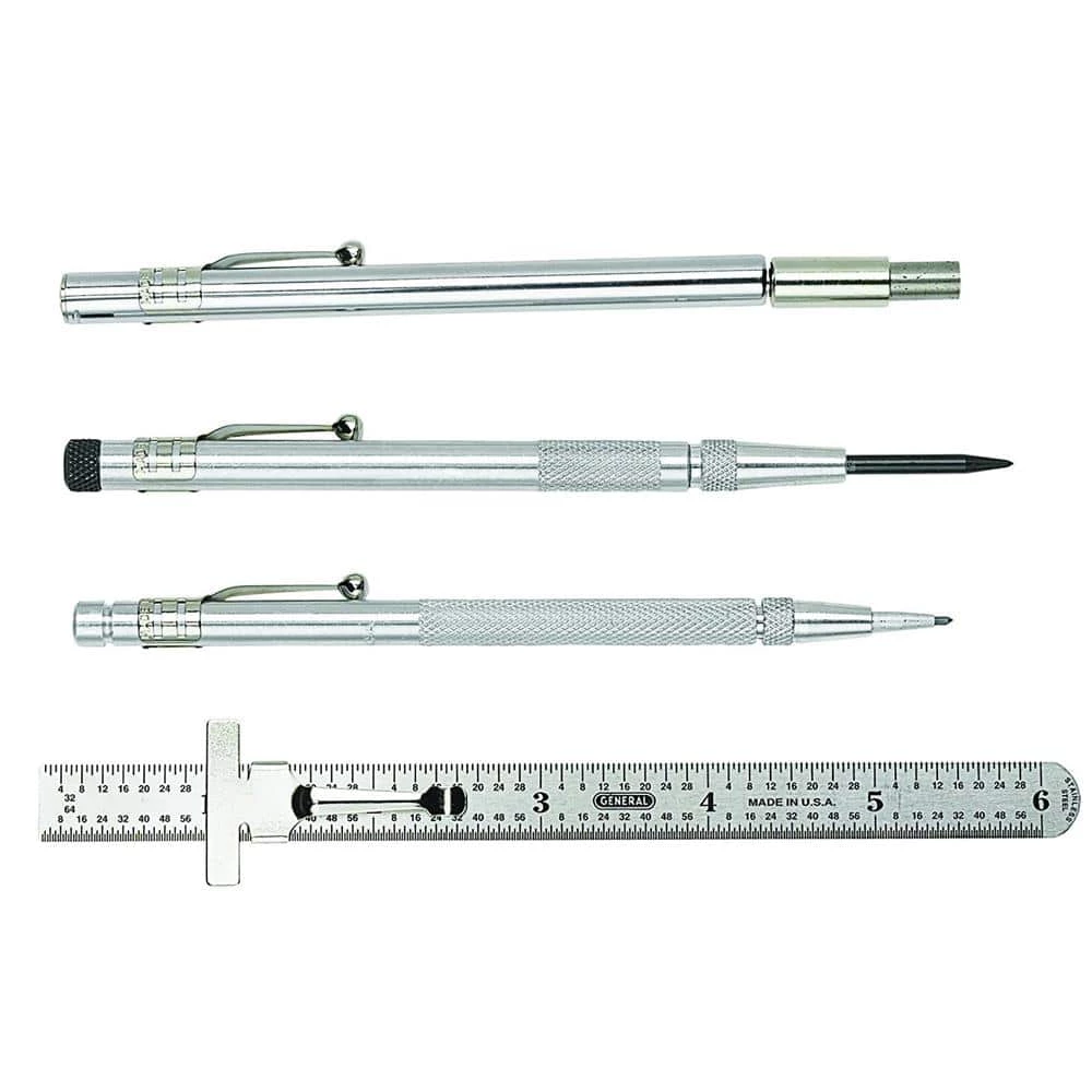 The General Tools Marking Set with Pocket Protector contains four popular tools in a convenient, pocket-sized carry case. This kit is great for mechanics, machinist, hobbyists or anyone on the go. The set includes a telescoping magnetic pickup, automatic center punch, scriber and 6 in. ruler. All the tools are packaged in a vinyl pocket protector which can be snapped closed.