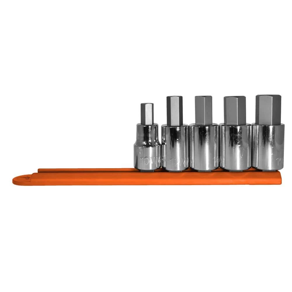 10-Piece SAE HEX includes 5/64, 3/32, 7/64, 1/8, 9/64, 5/32, 3/16, 7/32, 1/4 and 5/16. Socket bits can be used with the appropriate rachet, T-handle or socket spinner handle. Bits made from S2 tool steel with proprietary heat treat for superior strength and durability. Precision tip profile manufactured for positive and precise fastener engagement. Sockets made from alloy steel with proprietary heat treat for long life and lasting performance. Fully polished, chrome plated sockets for superior corrosion resistance. Design of socket and bit assembly allows for easy replacement of broket or worn bit. Tip sized appropriately to 1/4 in., 3/8 in. and 1/2 in. square drives for maximum torque and minimum damage to tips or fasteners. Bits and sockets made to exacting specifications. Comes with color coded storage rail.
