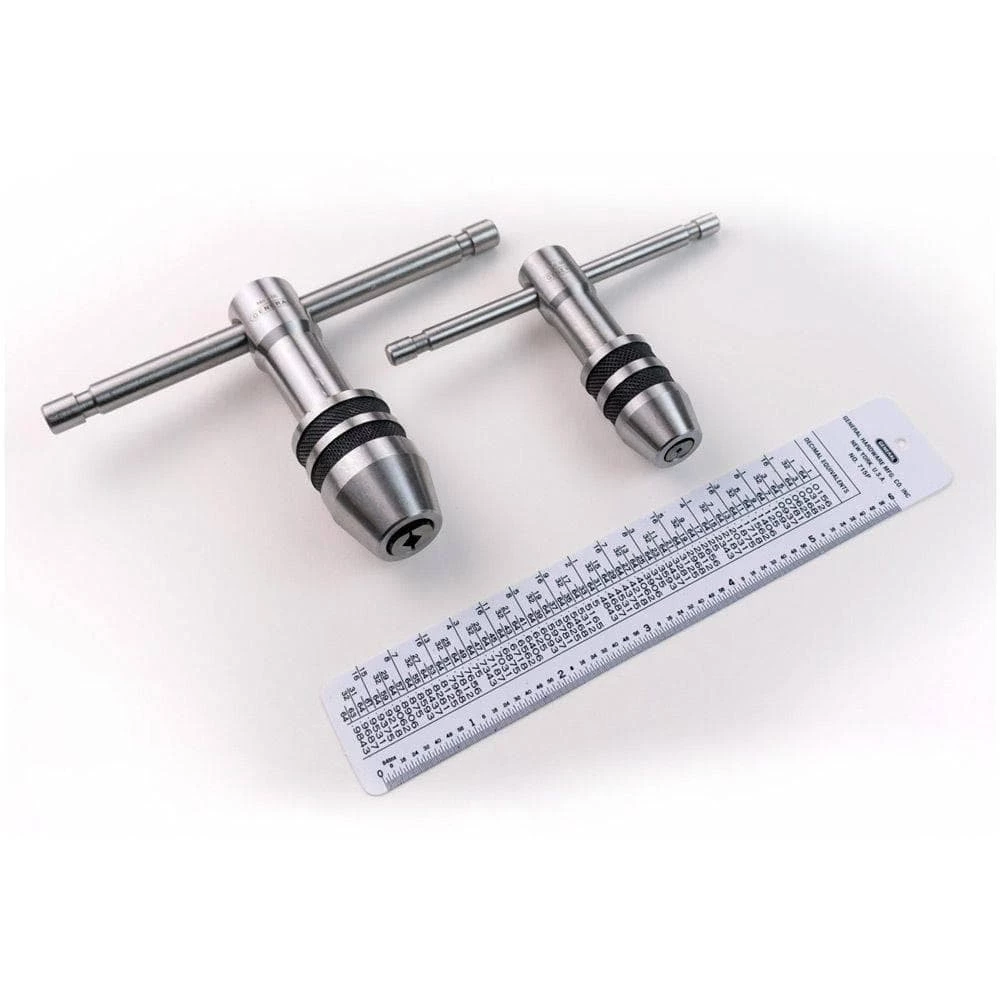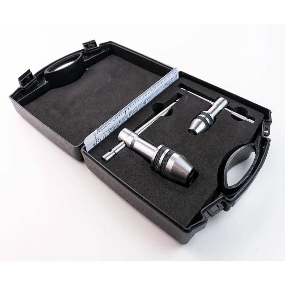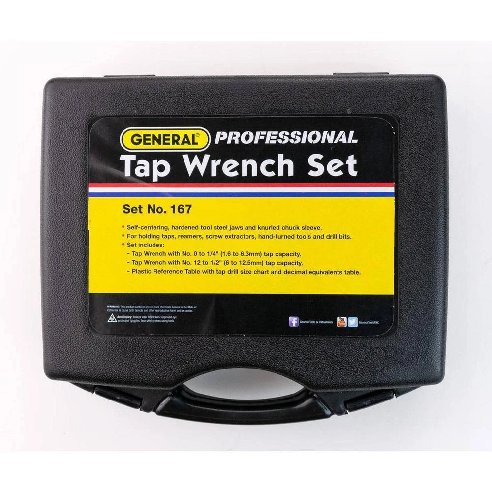 The General Tools 167 Professional Tap Wrench Set is perfect for creating straight and accurate thread holes in your work pieces. Great for mechanics, machinists and maintenance professionals, these tap wrenches have sliding T-handles that provide a large gripping surface while allowing ideal maneuverability and leverage in tight spaces. The hardened steel jaws have a self-centering chuck with a knurled chuck sleeve for a secure grip. This set comes with a tap wrench for number 0 to 1/2 in. taps and a tap wrench for number 12 to 1/2 in. taps. A reference guide featuring a screw size tap drill chart for 75% thread depth is also included. All pieces come packaged in a fitter, foam-lined plastic case.