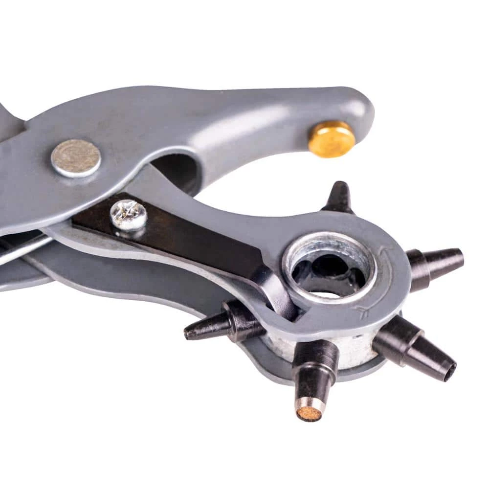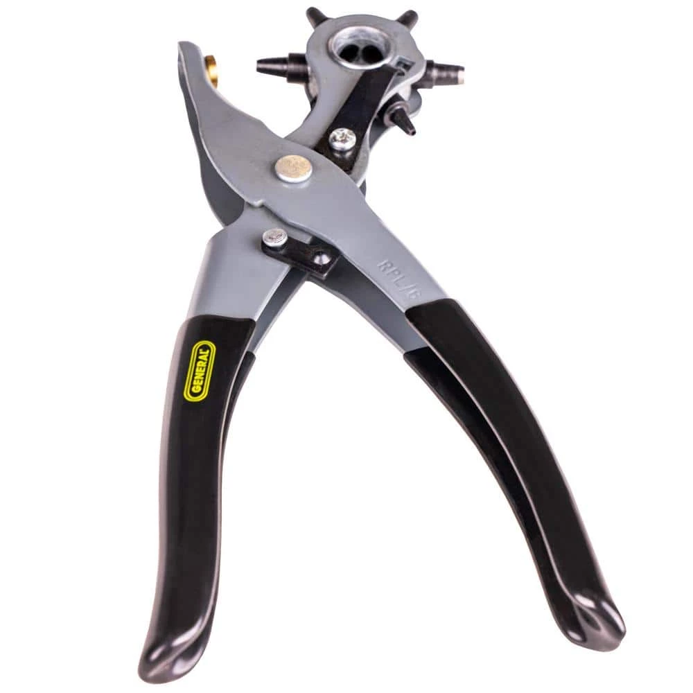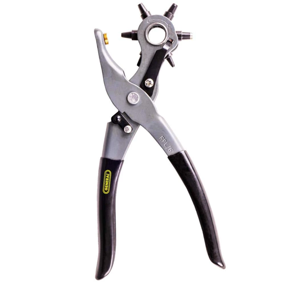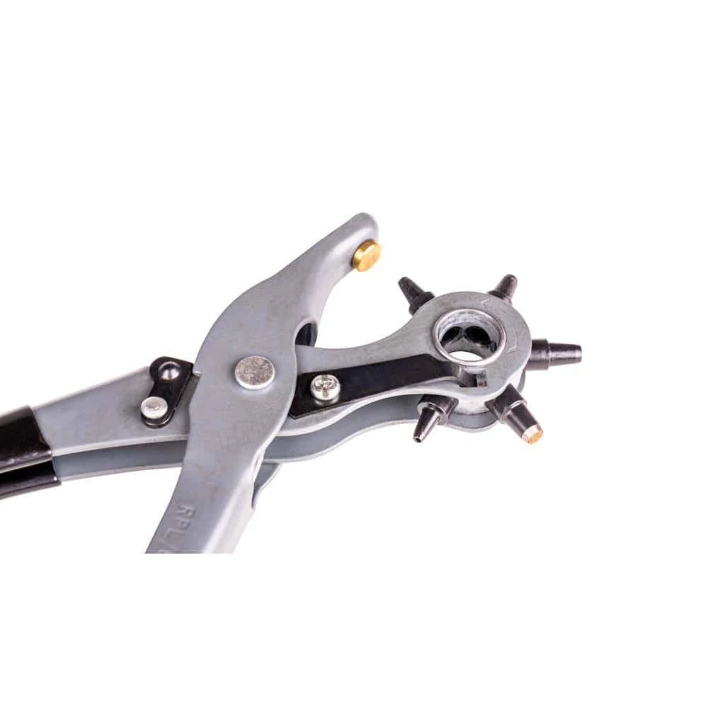 Get a convenient solution for punching round holes in leather, plastic, rubber, canvas and cardboard with the spring-tension, self-opening Revolving Punch Pliers. Constructed of plated steel with 6 tapered and hollow, hardened steel punches with sizes ranging from 5/64 in. to 3/16 in.