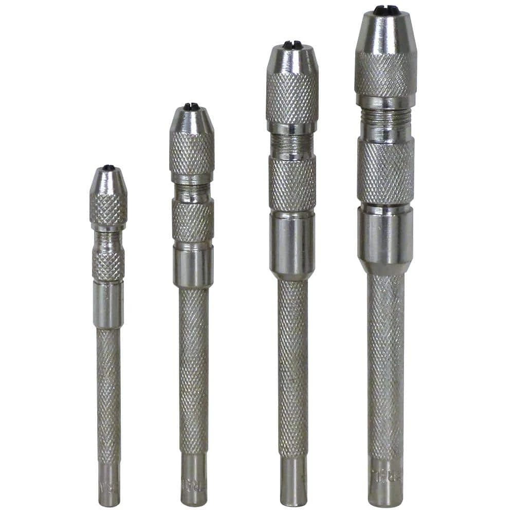 The General Tools single-end pin vises are great for holding small tools such as drill bits, taps and reamers. In addition, the bodies are hollow to enable the pin vises to be used with long rods or wire. Each one features a hardened steel collet with a unique jaw capacity for use with varying tool sizes. This four-piece set includes an entire selection of single-end pin vises with collet sizes ranging from 0 in. to 0.187 in.