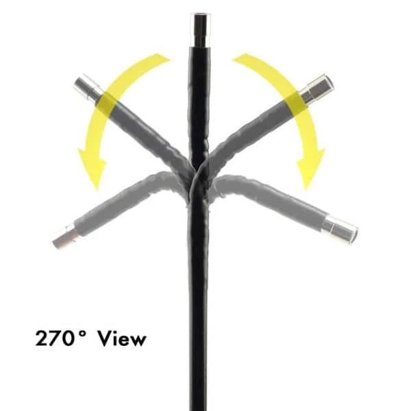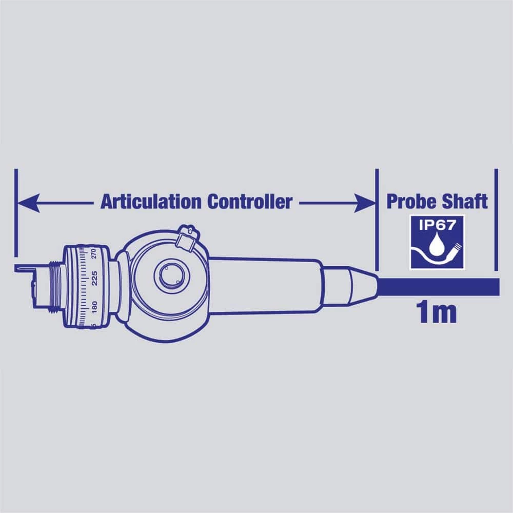 The DCS665-ART is a variant of the DCS665 Recording Waterproof Scope with an articulating probe. The P605-1ART probe is 1 m (3.3 ft.) long, with a diameter of 5.5 mm (0.22 in.) and a close-focus depth of field of 1.2 in. to 2.4 in. Its tip can be articulated (bent) ±90° to inspect targets off the probe’s main axis. Because the probe uses a mechanical lever to control the articulation angle, it is not completely watertight like the DCS665 console. The probe is, however, IP67 water resistant from its tip to the lever, which is near the probe’s base and probe connector.